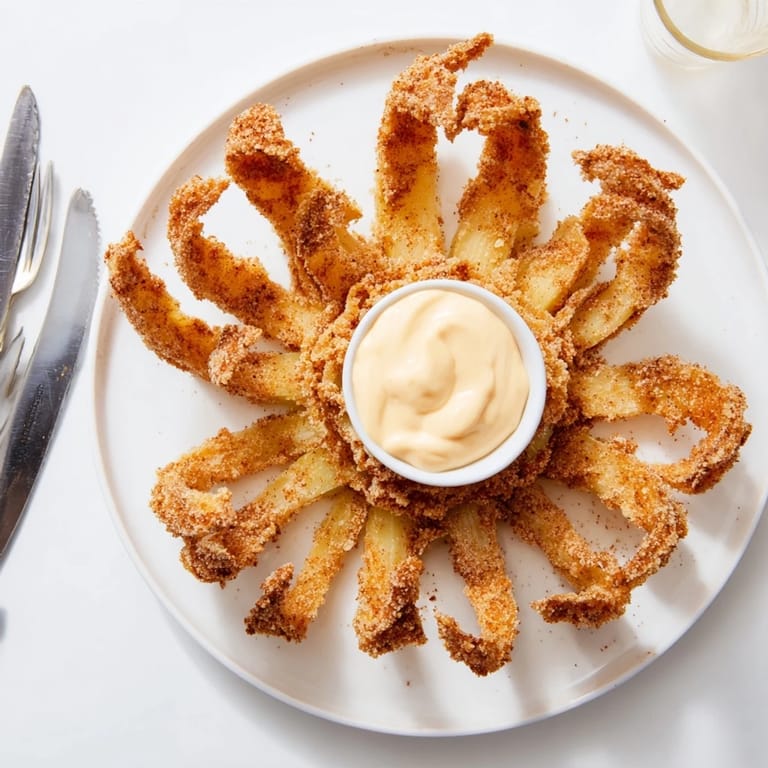 Save The first time I saw a blooming onion at a steakhouse, I honestly thought it was some kind of magic trick. Our server brought it to the table, and this golden, crispy flower of an onion sat there steaming gently, surrounded by a perfectly round ramekin of sauce. Everyone at the table went quiet for a second, just admiring it, before we all simultaneously reached in. That night I went home determined to reverse engineer it, and after about three attempts that ended as sad, clumpy onion piles, I finally figured out the secret.