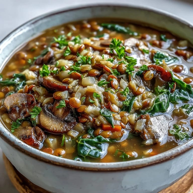 The combination of two different lentils and barley creates a protein-packed meal that keeps you full without weighing you down. Red lentils dissolve into a creamy base while brown lentils stay slightly firm, and the barley adds a chew and substance that makes you feel like you've eaten something real. Collard greens add iron and texture, mushrooms add umami, and suddenly what started as pantry staples becomes nutritionally complete.
