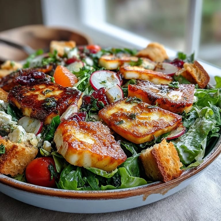 You can prep the dressing, vegetables, and croutons up to 24 hours in advance. Store them separately in airtight containers in the refrigerator. Fry the halloumi just before serving for optimal texture and flavor.