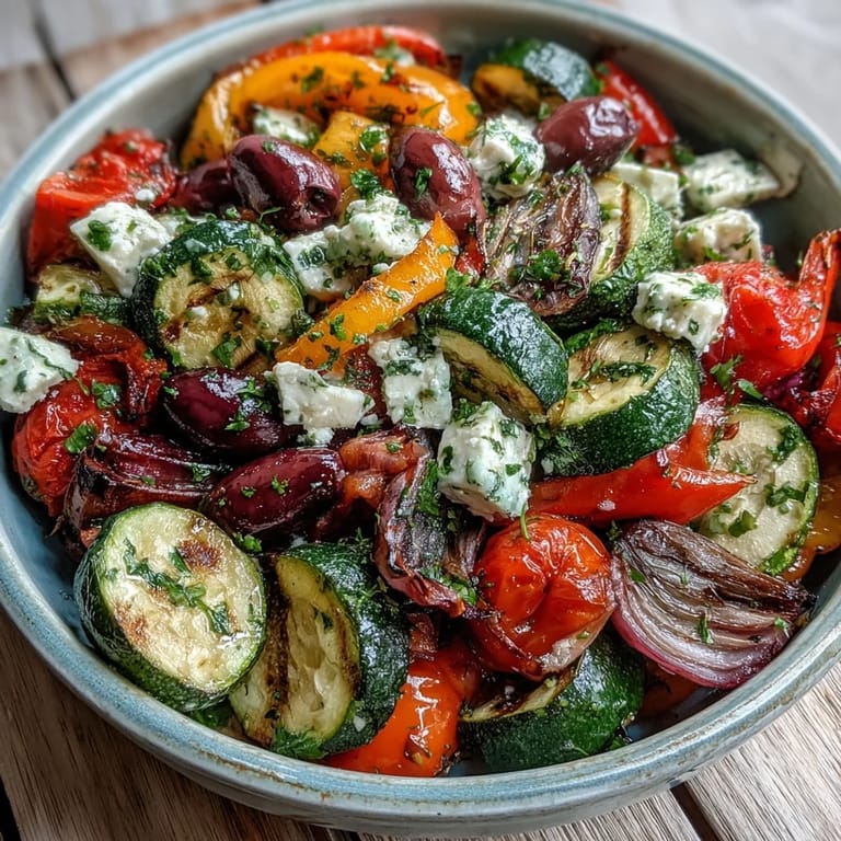 Most people don't think of salad as a warm dish, which is exactly why this version surprised me so much. The warm vegetables actually soften the salty bite of the olives and the richness of the feta, while the cool cucumber slices provide temperature contrast and textural relief. It's substantial enough to feel like a real meal, especially with some crusty bread on the side, but it never feels heavy or overwhelming. The warmth also helps the dressing absorb into the vegetables instead of just sitting on top.
